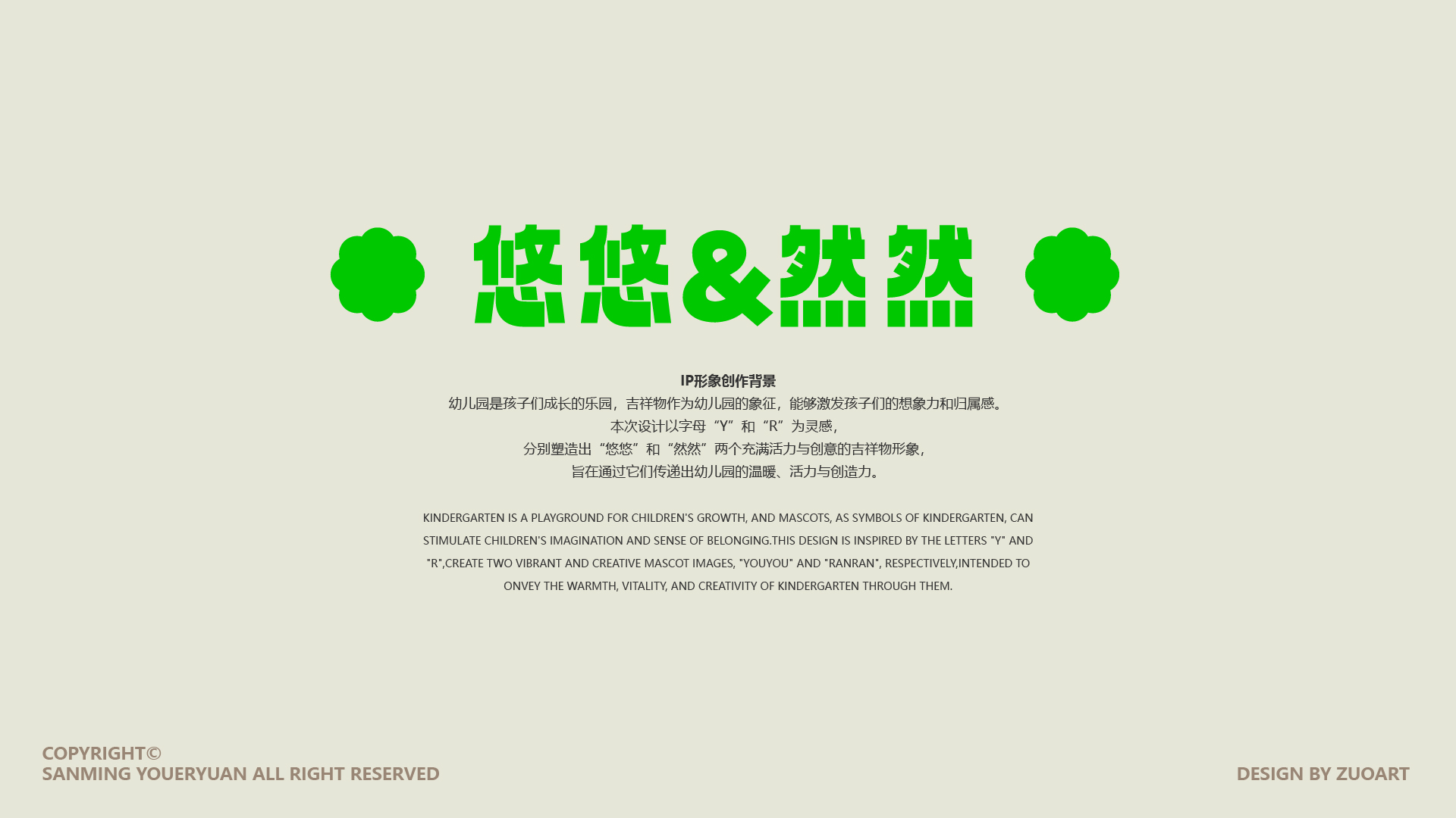 在这一理念指引下,幼儿园特别推出了两位吉祥物形象,以字母 “Y” 和 “R” 为设计灵感,创造出“悠悠”和“然然”两位充满活力与童真的伙伴。